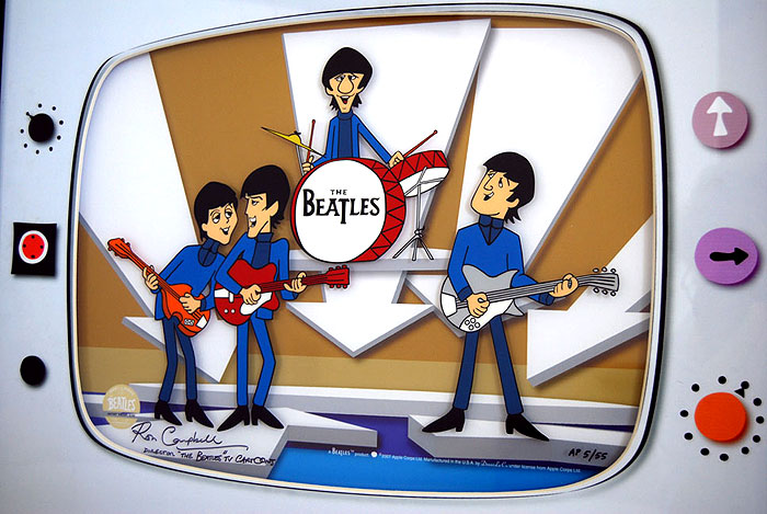 This Sericel celebrates the Beatles first live television performance using the foreground cel image from the cartoon episode, "Misery" and