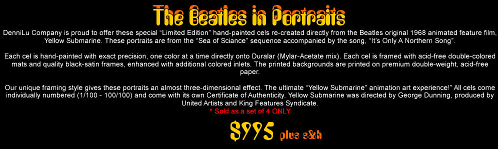 | Unless otherwise specified, the entire contents of this web site; images, art and any/all subwebs, are the exclusive property of the DenniLu Company and may not be reproduced in any format, at any time, for any purpose. These images may not be used in any business or commercial endeavor. Any violations will be pursued to the fullest extent allowed by law. DenniLu Company is under license from Apple Corps Ltd. |