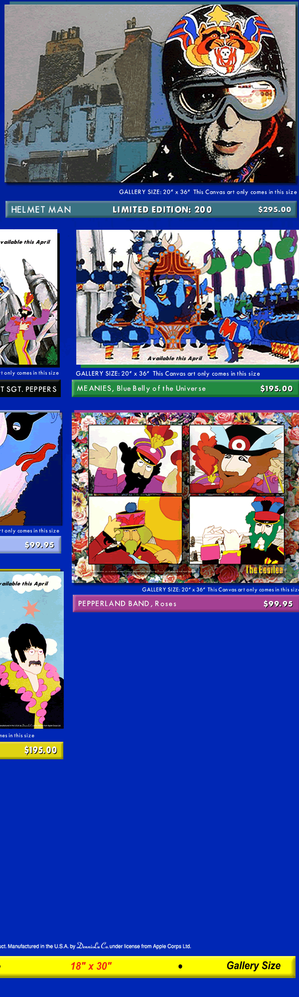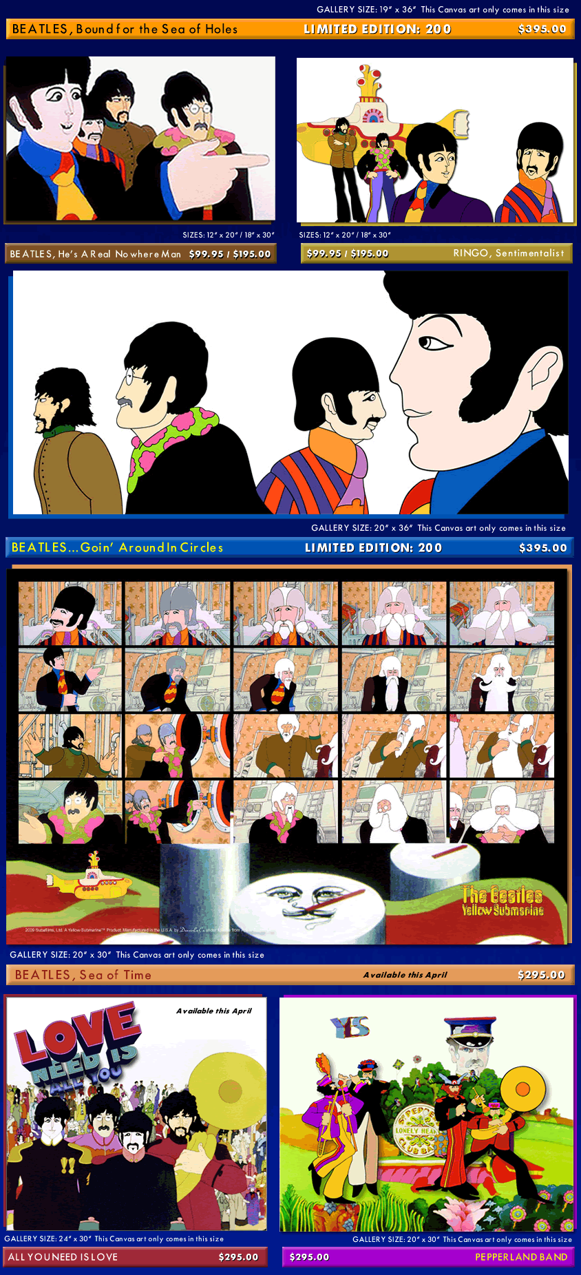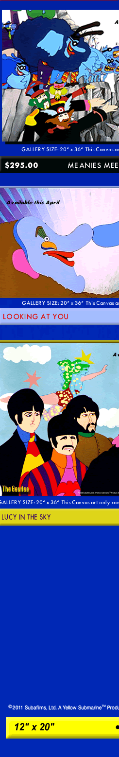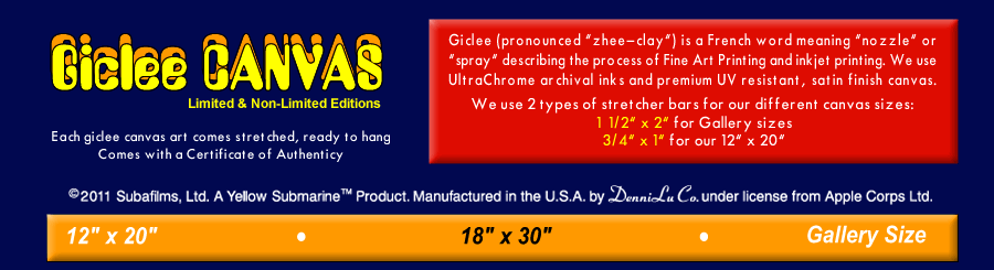 These limited and unlimited GICLEE CANVAS' from The Beatles original 1968 animated feature film are offered in several sizes at affordable prices. Yellow Submarine was directed by George Dunning, produced by United Artists and King Features Syndicate. |